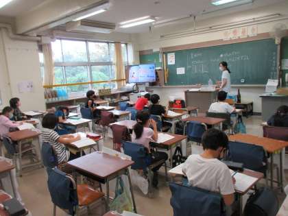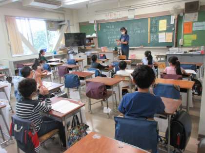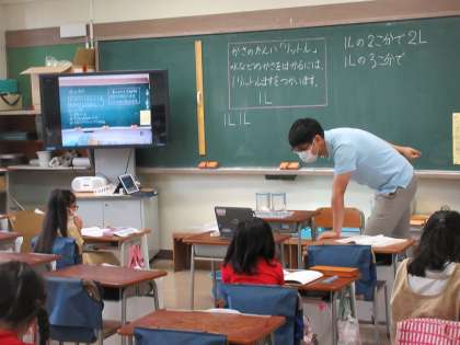 2年生の算数の授業で水のかさの学習です。先生は端末に向けて話しかけるなど、自宅で学習している子どもたちにも声をかけながら授業をしています。