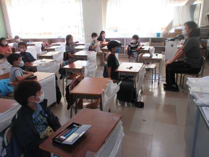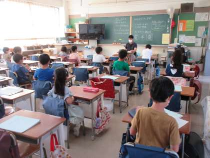 今日はAグループが登校でBグループが自宅学習です。2年生の朝の会の様子です。子どもたちは落ち着いて過ごしているようです。