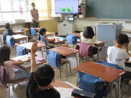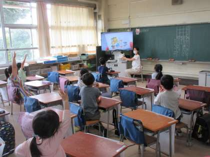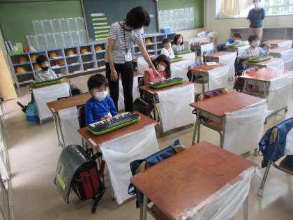 1年生の授業。国語の物語の学習や音楽の鍵盤楽器の演奏の学習。先生が読み聞かせをしているクラスもありました。