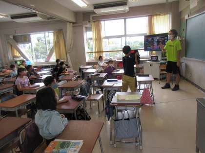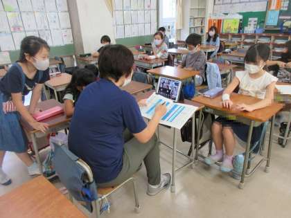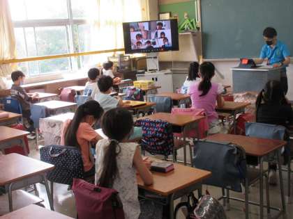 今日はBグループの登校です。3年生の朝の会の様子。担任の先生が端末を通して自宅にいる一人ひとりの子どもにも声をかけていました。