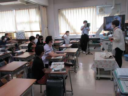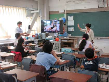 5年生の英語。英語支援員の先生にも教えていただきます。自宅にいる子どももいっしょに授業を受けます。夏休みにあったことなどを振り返っていました。
