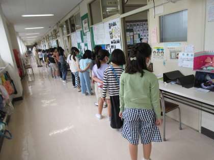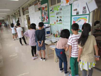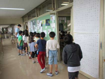 2年生が自由研究を見ています。落ち着いて行動することができています。