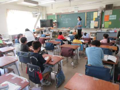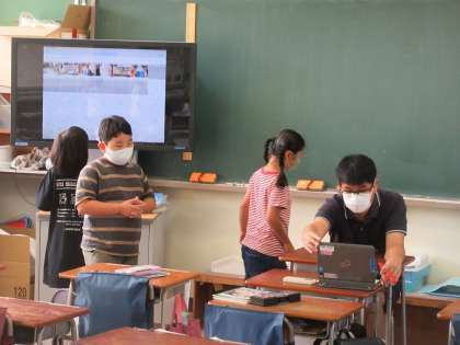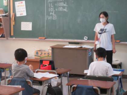 2年生の算数のかさの学習。単位の理解が大切です。自宅に学習している子に担任は声をかけながら授業をしています。