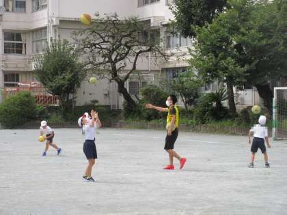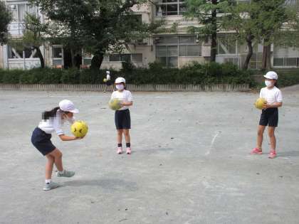 校庭の体育は1学級ずつとしました。3年生の体育の学習です。担任の先生は友達と間隔をあけるように声掛けをしています。