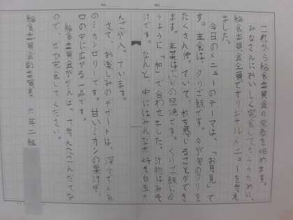 給食委員会の児童は、ポスターを作り、給食のワンポイントも考えました。みんなが完食してくれるように、と考えたメニューです。