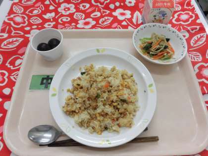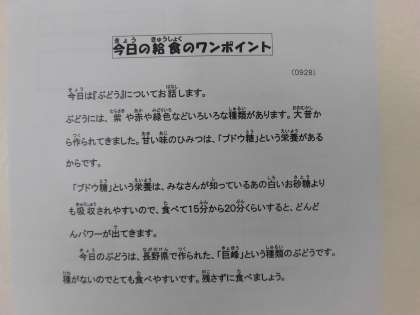 【献立】そぼろごはん・野菜のおかかかけ・ぶどう・牛乳