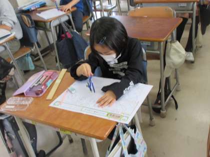 3年生が身に付けたいのがコンパスを使って円を描く技能です。まだうまく操作できない子もいますが、頑張って描けたときに見せる笑顔はすてきです。