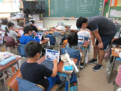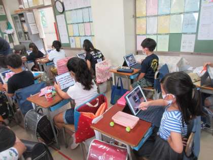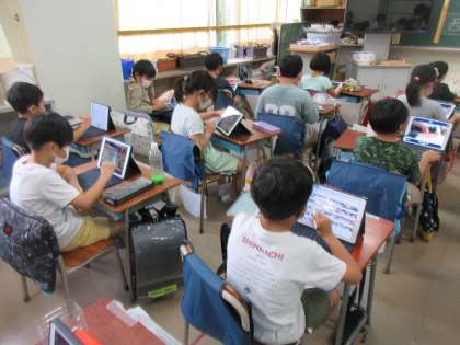 友だちが作った動くおもちゃの動画を見ていました。友だちの動画を自由に見られます。直接的な交流がしずらい中、端末を通してですが交流をしています。