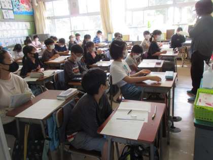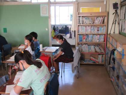 今回は定点カメラ(端末)を教室の後ろに設置し、授業の雰囲気を見ていただくようにしています。6年生は落ち着いた様子で学習に取り組んでいます。