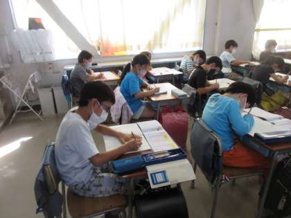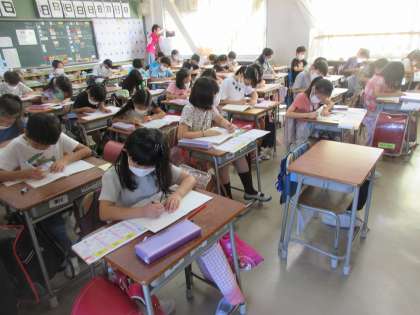 子どもたちは真剣に漢字の学習をしています。先生が時折端末の状況を確認しながら授業を進めています。