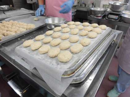 久しぶりに給食室の様子をご紹介します。豆腐ナゲットを作っている様子です。