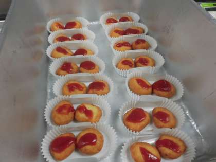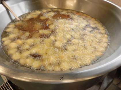 下処理室で一個ずつ形を作り、次は回転釜で揚げます。教室で盛り付けしやすいように、今日は一人分ずつカップにいれてケチャップをかけました。