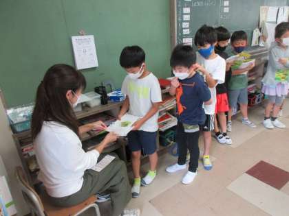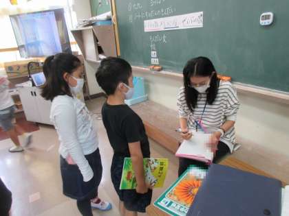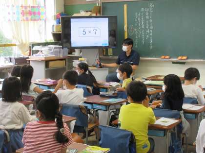 かけ算の学習がスタート。初めは一番わかりやすい5の段。暗唱をして合格するとシールを貼ってもらえると子どもたちはうれしそうでした。端末を使って学習場面もありました。