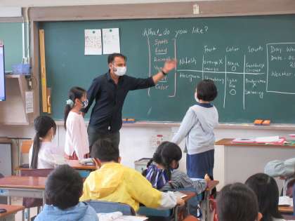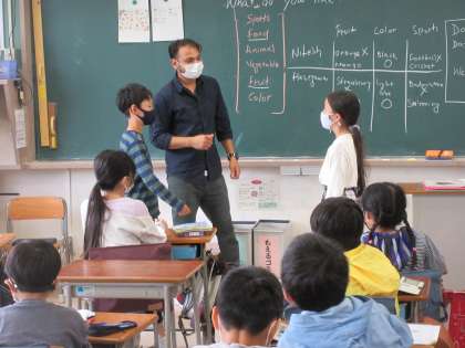 “What ○○ do you like?”“I like ○○.”好きな色や食べ物など自分のことを伝え合う学習です。先生の励ましもあり、みんなの前で質問や応答をしていました。