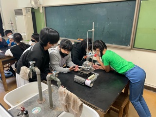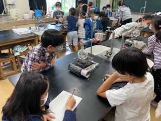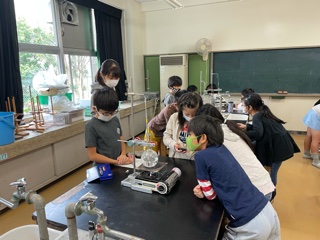 水の3つのすがた。フラスコの中の水を熱し続けた時の様子を観察します。静かに取り組んでいます。