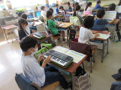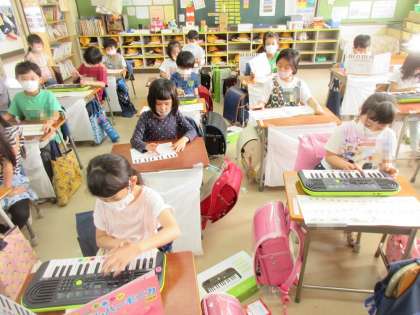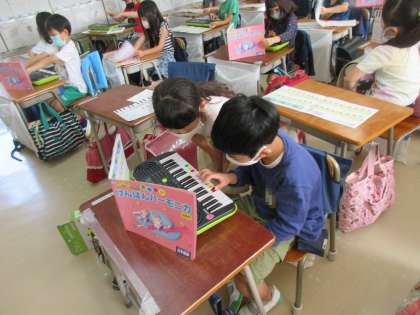 2人に1台のミニ電子ピアノを使って交代で練習しています。待っているときには鍵盤の絵の上で指使いの練習をしています。教え合っているペアもありました。