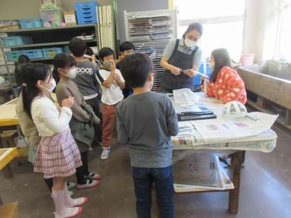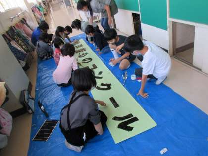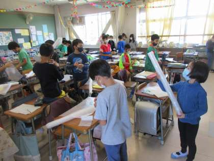 3年生が教室と図工室に分かれて学芸会で使う道具を作っています。みんなで考え合いながら協力して作業しています。