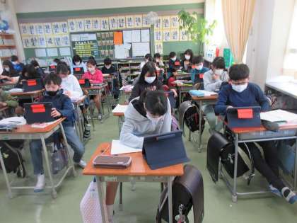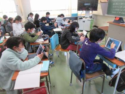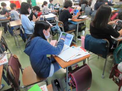 流れる水の働きについて、学習用端末を使って多摩川の上流と下流の様子を調べていました。教室にいながら川の様子を詳しく調べることができます。