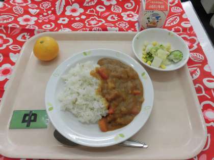 【献立】麦ごはん・カレー・白菜とコーンのサラダ・みかん・牛乳