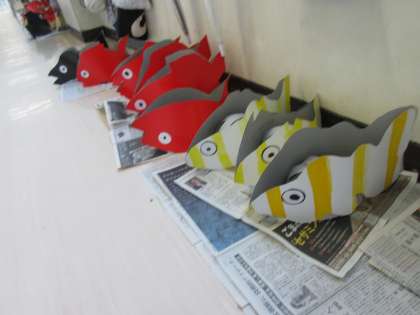 2年生の教室前のろうかには作ったばかりの小道具が置いてありました。これをかぶればきっと魚の役になるきることができるでしょう。