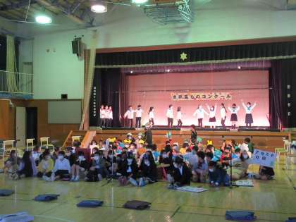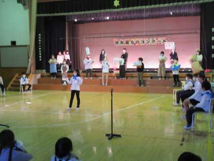 学芸会が近づいてきて子どもたちは本番を意識して練習をしています。3年生の劇にはおもしろい国がいろいろ出てきます。体育館を広く使い、密にならないようにしています。