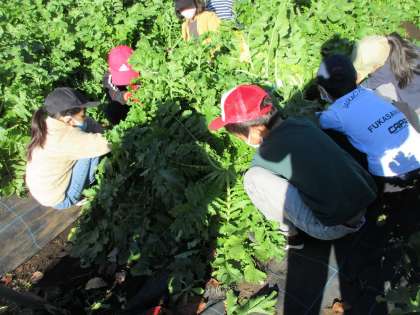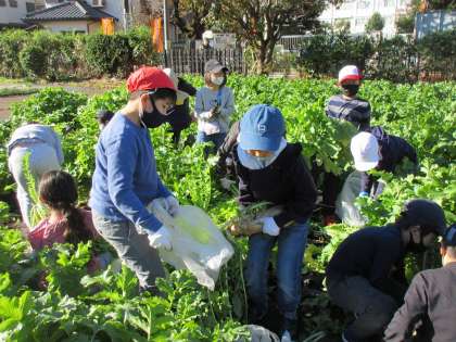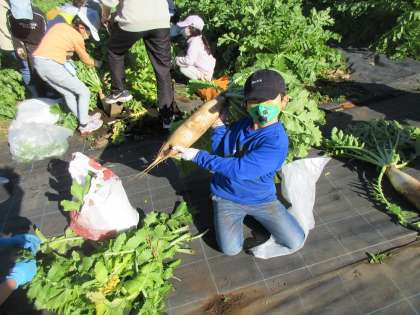秋晴れのもと、2年生が秋山農園さんで大根の収穫をしました。大きくて太い大根はなかなか抜けません。友達と協力してようやくとれると子どもたちは大喜びでした。