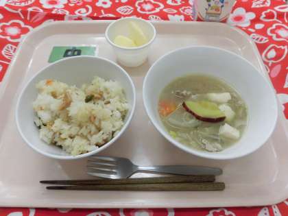 【献立】こぎつねごはん・さつま汁・りんご・牛乳