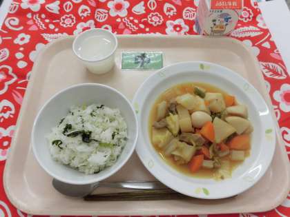 【献立】青菜ごはん・豚肉と大根のうま煮・ホワイトゼリー・牛乳