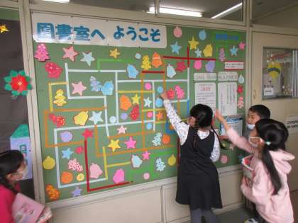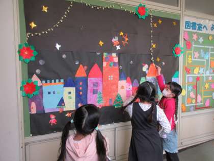 図書室前の掲示板がクリスマスバージョンにリニューアルされていました。図書司書の先生が作ってくださっています。子どもたちは大喜びでした。