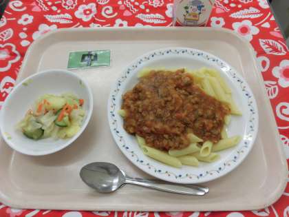 【献立】ペンネのポロネーゼ・ポテト入りフレンチサラダ・牛乳