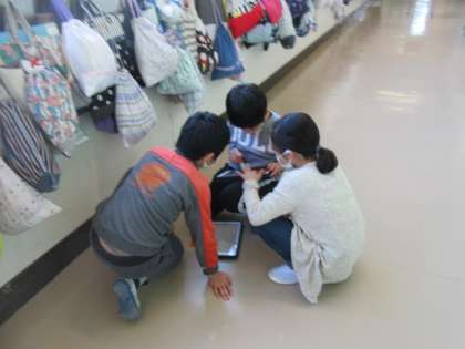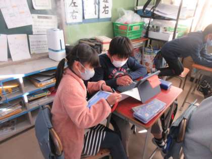 端末を使って何かをしています。これは係活動です。みんな楽しそうです。