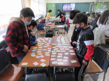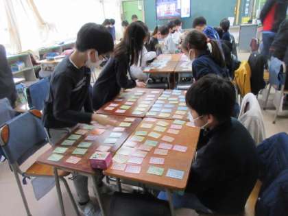 チーム対抗の百人一首大会。みんなとても真剣です。詠み手はコンピューター。音声と映像をもとに子どもたちが札を見つけていました。