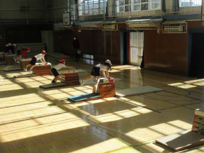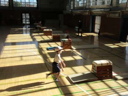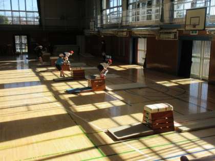 決まりを守り、安全に体育の学習ができています。開脚跳びの後は台上前転の練習に取り組みます。
