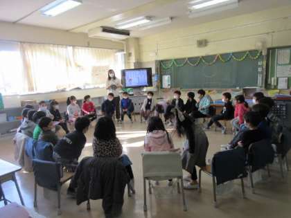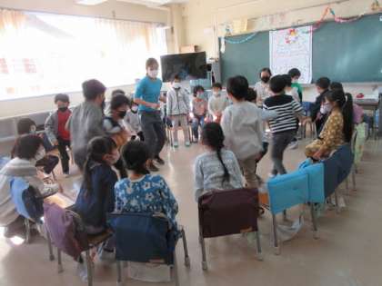 1年生がクラスでお楽しみ会やお別れ会をしています。みんなで楽しい時間を過ごしています。