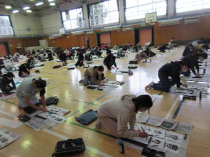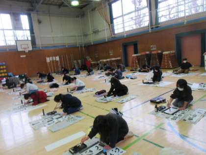 5年生は体育館で3クラスが合同で書き初めをしています。人としてさらに成長できるように「豊かな心」と書いています。体育館が暖房が入り、あたたかです。