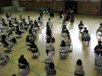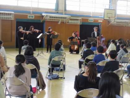 プロの演奏家のよる弦楽五重奏です。これは世田谷区の連合行事で本来は大きなホールで開催されます。間近で鑑賞できる貴重な機会です。何かを感じ取ってくれるといいです。