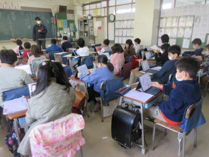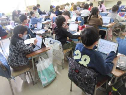 学習用端末を使って意見交換をしています。友達の課題を参考にしながら意見を述べ合っています。