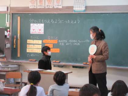 自分の思いをわかってもらえるように伝えるにはどんな言葉や態度で伝えたらいいのか、ロールプレイを取り入れながら学習していました。きちんと伝えると自分も相手もハッピー。すてきな授業でした。