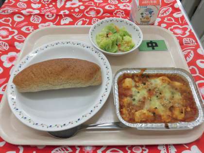 【献立】胚芽パン・豆腐のグラタン・野菜のカレードレッシング・牛乳