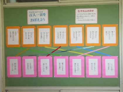 2月になり図書司書の先生が掲示物を新しくしてくださいました。今月は百人一首です。子どもたちが興味をもてるように工夫されています。