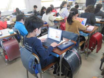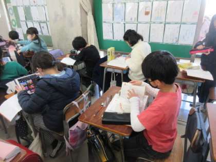 考えや気持ちを表す言葉の意味を子どもたちはタブレットと国語辞典のどちらかを選択して調べています。