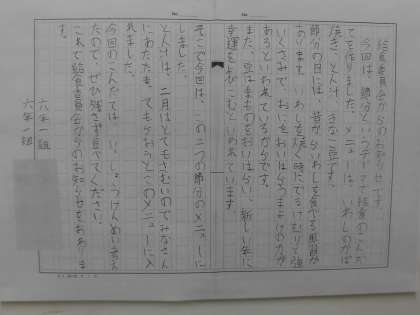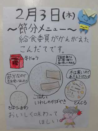 今日は給食委員会の子どもたちが考えたメニューを実施しました。今年度はこれが最後の委員会メニューとなりました。テーマは節分です。しかも「深沢小のみんなが残さずに食べてくれる給食」を考えました。子どもたちが給食を紹介するポスターをつくり、昼の放送で料理の説明もしました。