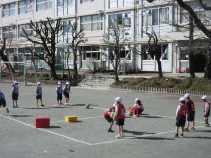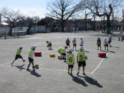 ぽかぽか陽気。1年生が複数のボールを使って楽しくサッカー型ゲームをしています。