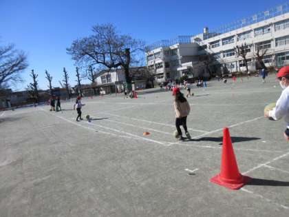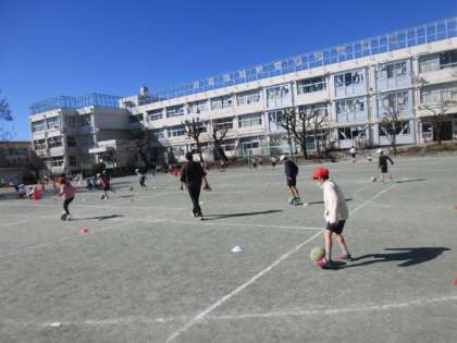 外は見事な晴天です。サッカー型のゲームの学習で1人1個ずつボールを使ってドリブルの練習をしています。