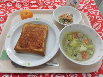 【献立】ガーリックトースト・ポトフ・もやしとツナのサラダ・ぽんかん・牛乳