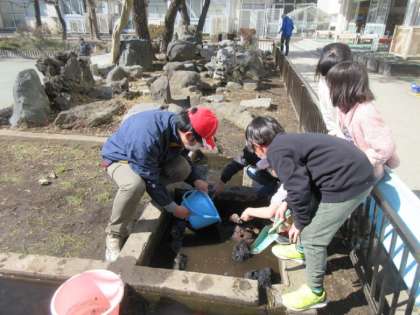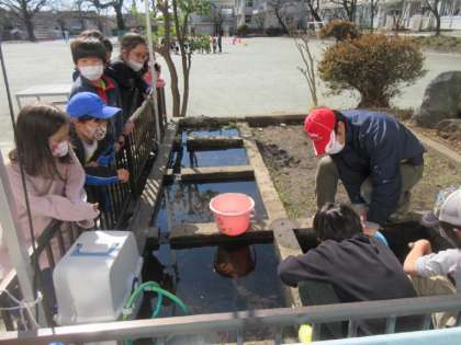 今は使っていない田んぼをメダカの池に作り替えています。教室で飼っているメダカをここに放すそうです。