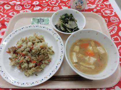 【献立】豚肉とごぼうのごはん・じゃこサラダ・みそ汁・牛乳