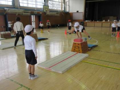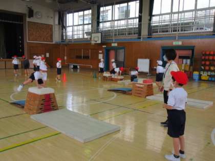 自分の合った練習ができるように工夫されています。子どもたちは互いに見合いながら跳び箱の練習をしています。