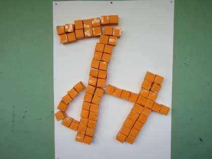 4年生のろうかに6年生を送る会のスローガンの文字が掲示してあります。よく見ると立方体の箱が並んでいます。少し前に立体の学習をしていました。Good idea!