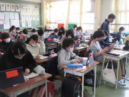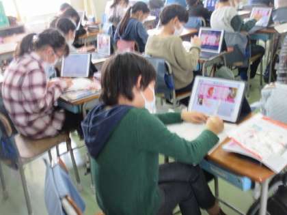 生命の誕生の学習。端末を使うと資料が詳しく見られ、とても便利です。